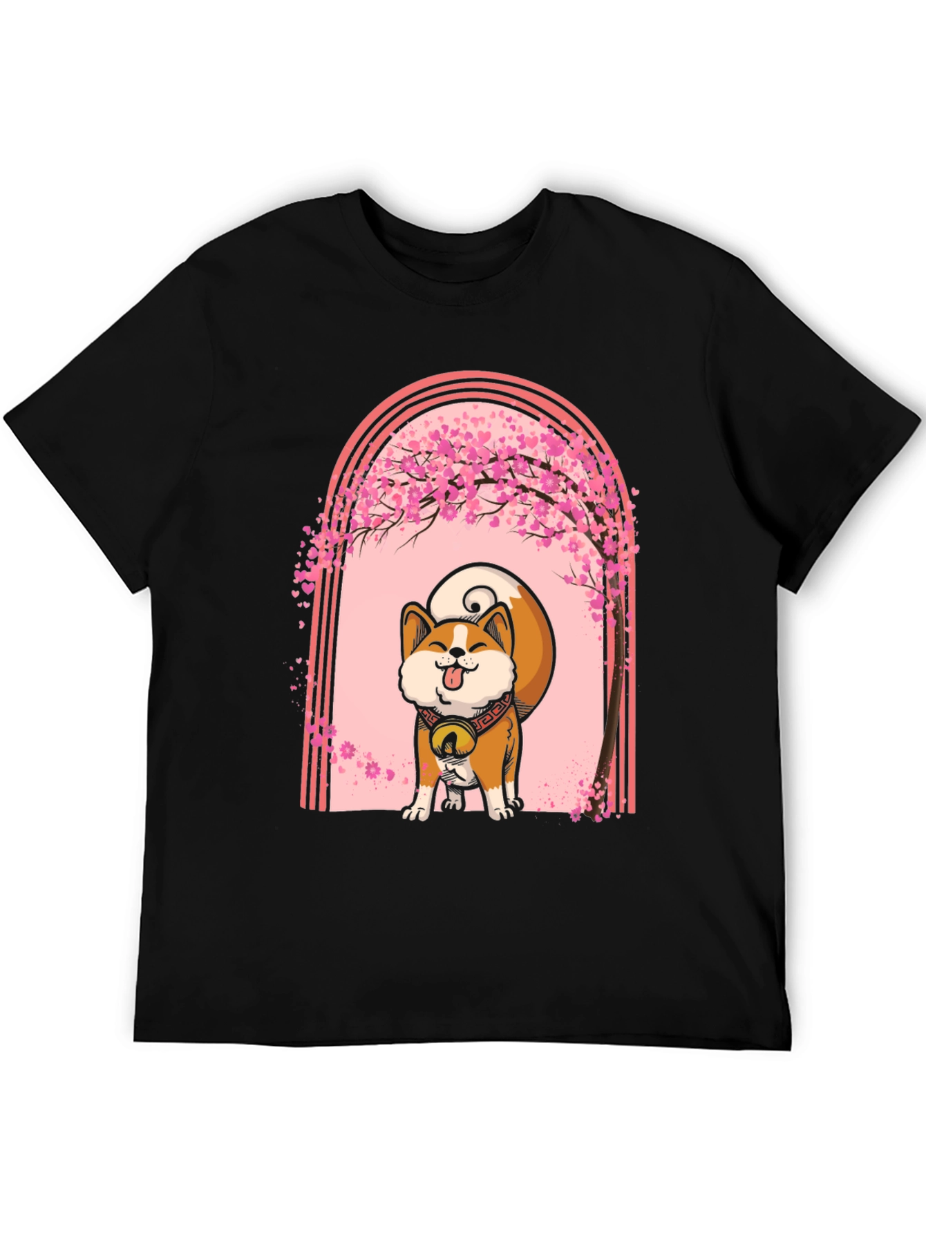 This black t-shirt features a vibrant and playful design of an Akita Inu dog standing beneath a cherry blossom tree. The dog is depicted in a cartoon style, with a cute expression and wearing a decorative collar. The cherry blossom tree adds a touch of oriental charm. The design is framed by a pink arch, creating a visually appealing and balanced composition. Made from a soft and comfortable fabric, this t-shirt is perfect for everyday wear. It's a great way to express your love for dogs and Japanese culture. Ideal for casual outings, dog walks, or simply lounging at home. Get yours now and show off your unique style!