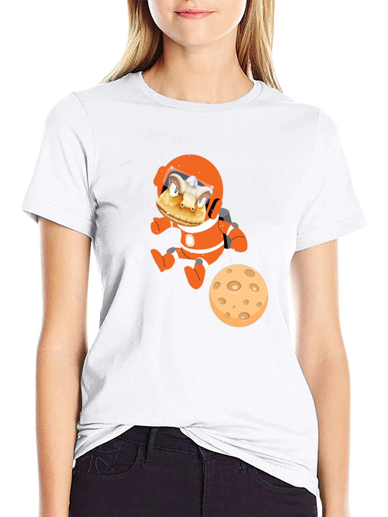 Explore the cosmos in style with this eye-catching black t-shirt featuring a fun alien astronaut graphic. The design showcases a cartoon-style alien creature in a bright orange spacesuit, complete with helmet and boots, floating alongside a moon. Made from soft, comfortable fabric, this tee is perfect for casual wear, space enthusiasts, or anyone looking to add a unique touch to their wardrobe. Stand out from the crowd with this fun and quirky design that is sure to spark conversations and turn heads. A must-have addition to any t-shirt collection!