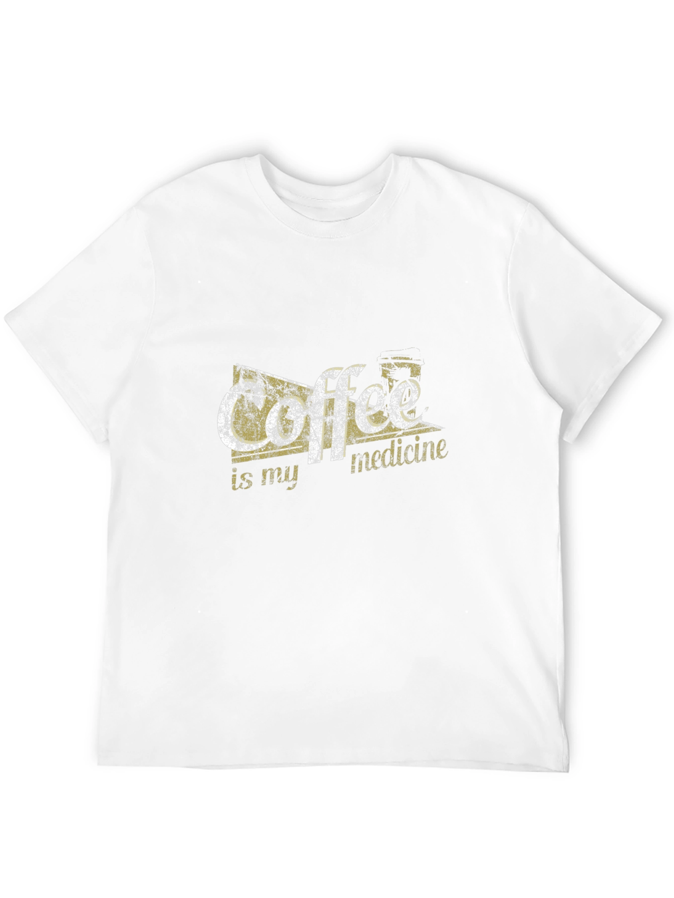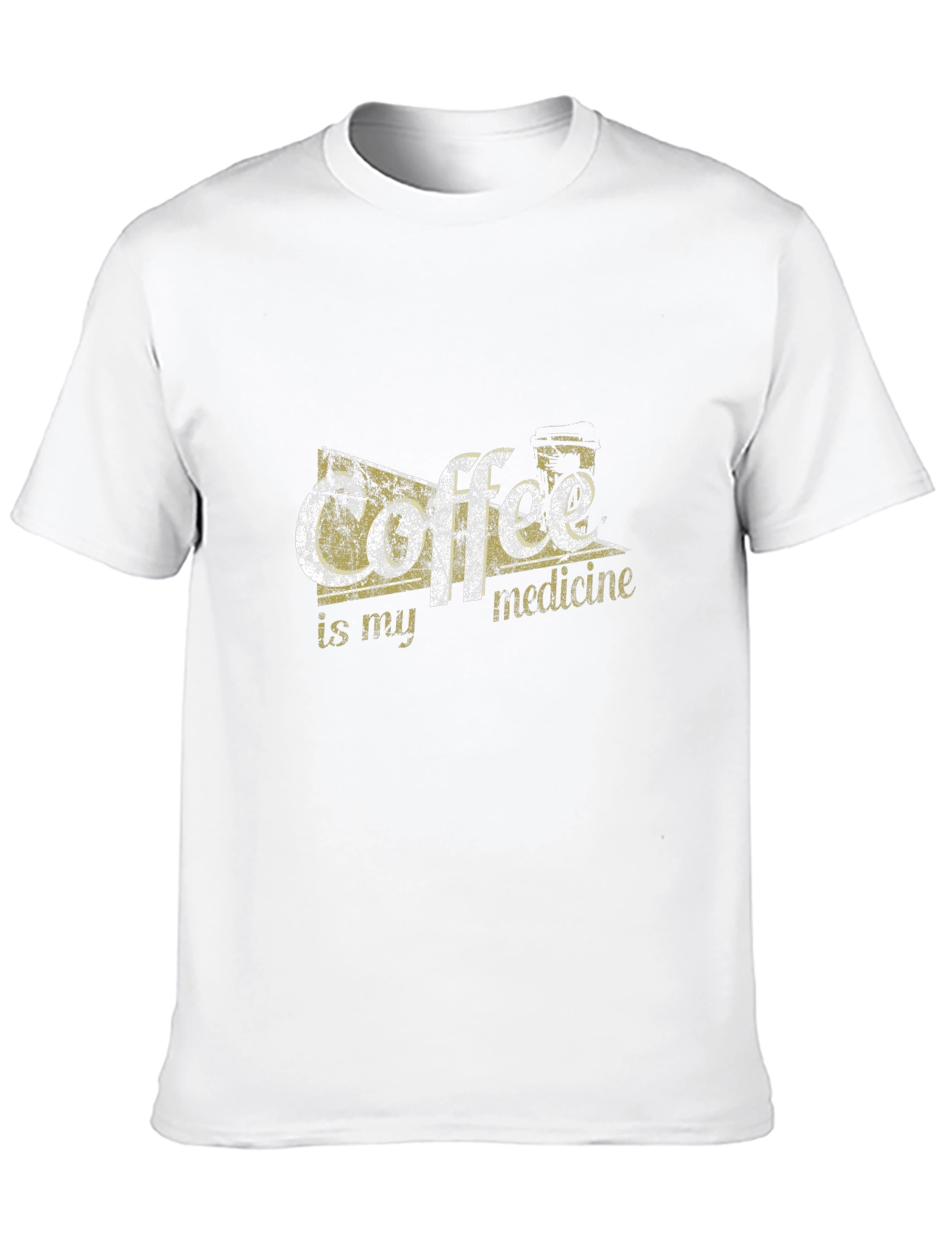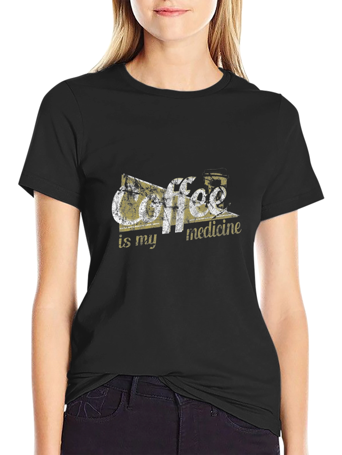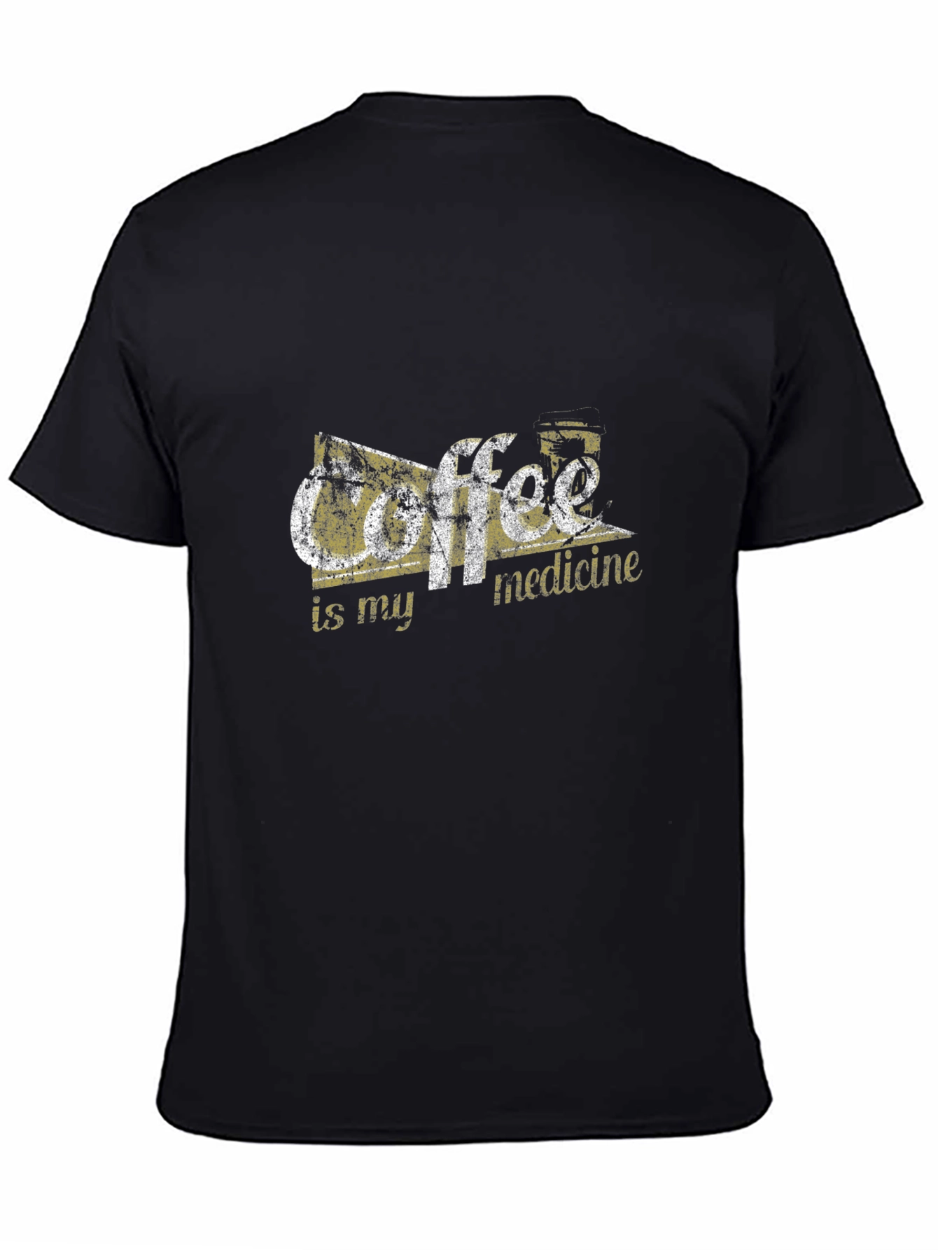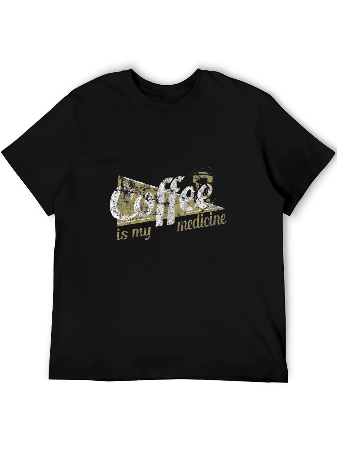 Start your day right with this bold black graphic t-shirt. Featuring a distressed vintage-style design proclaiming "Coffee is my medicine," this tee is perfect for coffee lovers with a sense of humor. The print showcases a unique worn effect, giving it a cool, retro vibe. Made from comfortable and breathable fabric, this shirt is ideal for casual wear, coffee shop visits, or lounging at home. A must-have addition to any coffee enthusiast's wardrobe, sure to spark conversation and showcase your caffeine-fueled spirit.