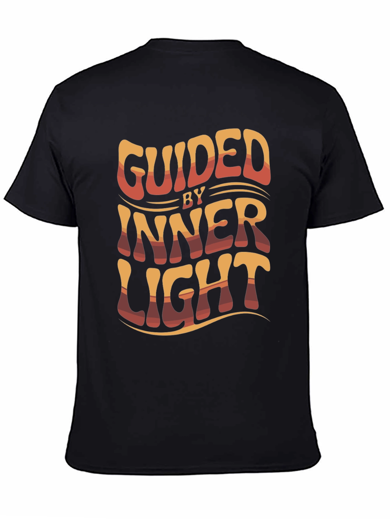 Embrace your intuition with this vintage-inspired graphic tee. The black shirt features a striking retro design with the words "Guided By Inner Light" in warm orange and brown hues, creating a captivating visual statement. Made from comfortable fabric, this tee is perfect for everyday wear and casual outings. Show off your unique style and positive mindset with this eye-catching piece. Ideal for those who seek guidance from within and appreciate retro aesthetics. Elevate your wardrobe with this meaningful and fashionable tee.