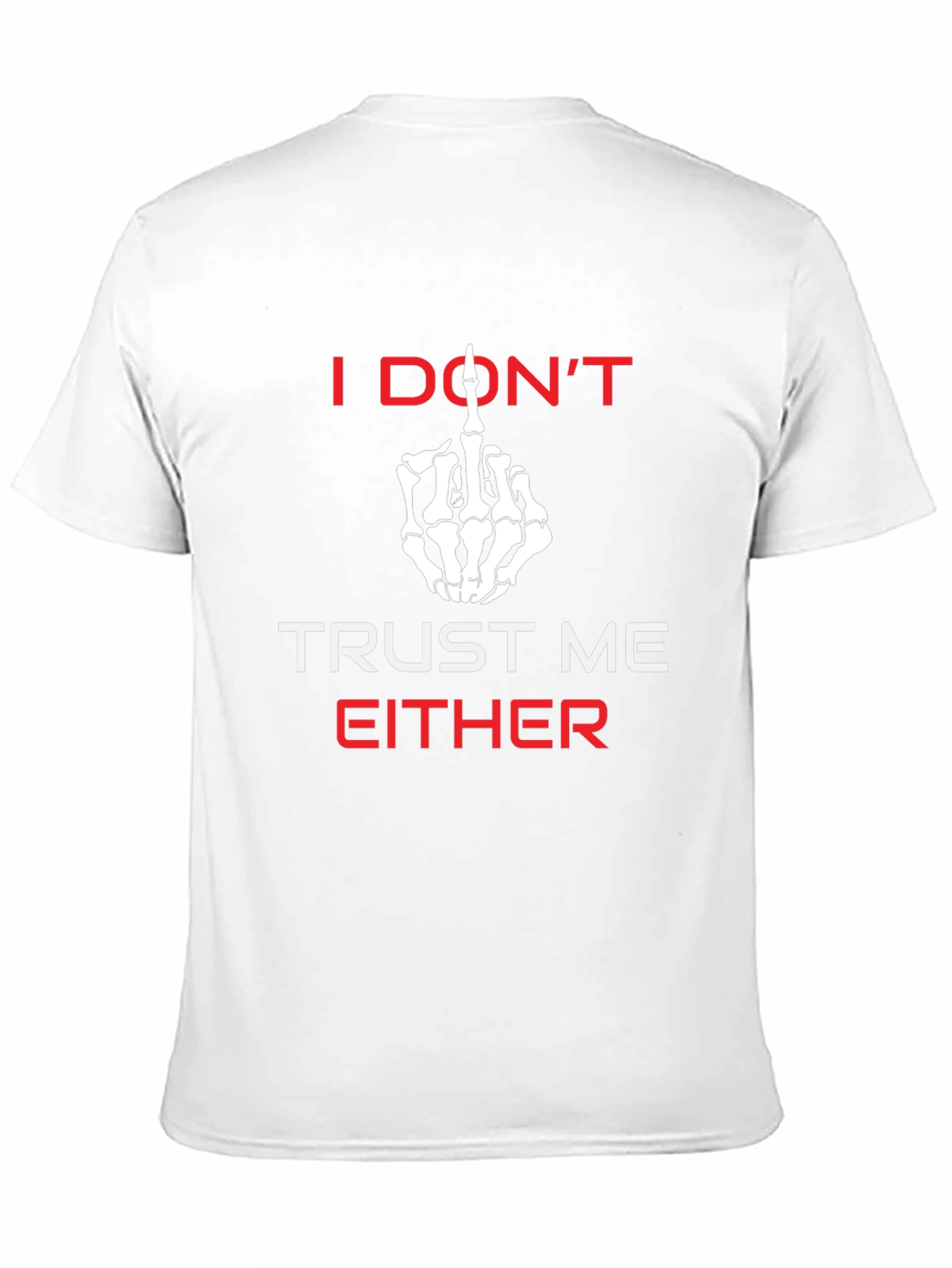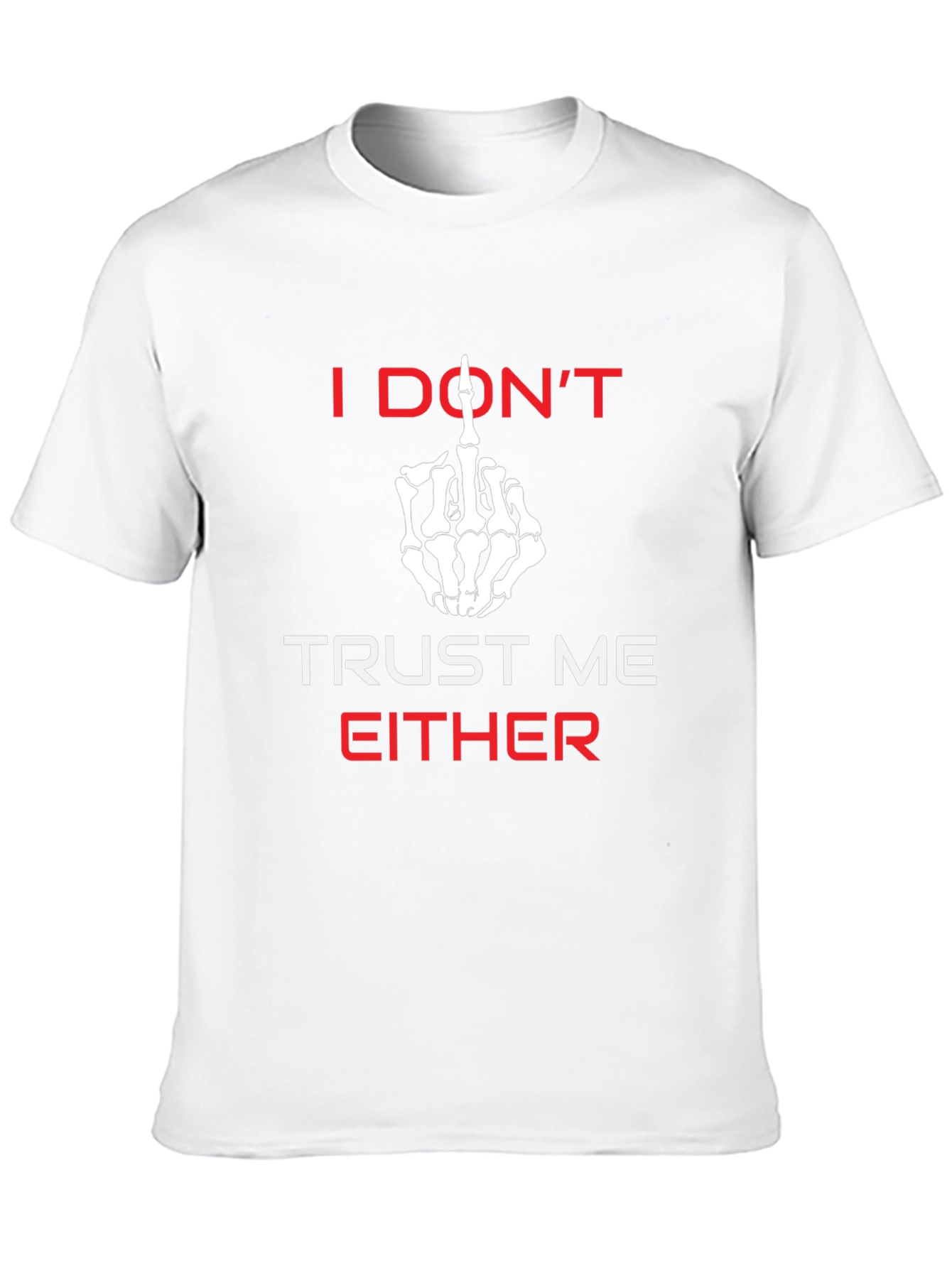 Show off your edgy side with this black graphic t-shirt. Featuring the phrase "I DON'T TRUST ME EITHER" in bold lettering, with a skeletal hand giving the middle finger, this tee is sure to turn heads. Made from a comfortable-looking fabric, this tee is perfect for casual wear, concerts, or any occasion where you want to make a statement. Pair it with jeans or shorts for a cool and confident look. This tee is for those with a sense of humor and a daring sense of style. Make a statement without saying a word!